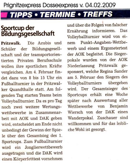Bereits seit mehreren Jahren ist die Bildungsgesellschaft mbH in Pritzwalk bemüht das lange avisierte Credo „In einem gesunden Körper, steckt auch ein Gesunder Geist“ intensiver zu bearbeiten.